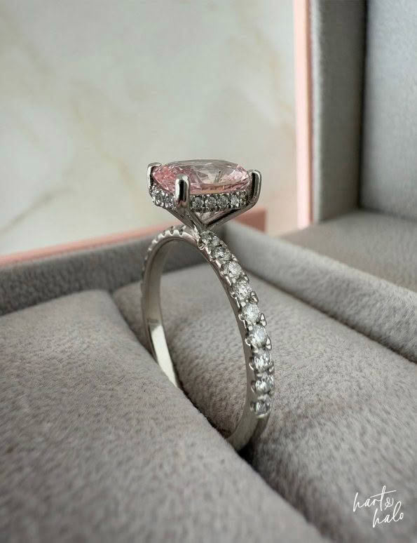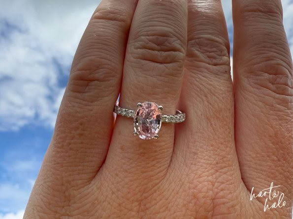 Jessie found us on Instagram and thought ‘why not’. They visited us and with no pressure or intent, found their Sapphire! Jessie hadn’t been sure about colour, but the delicate peachy pink of this one was love at first sight – she just knew.